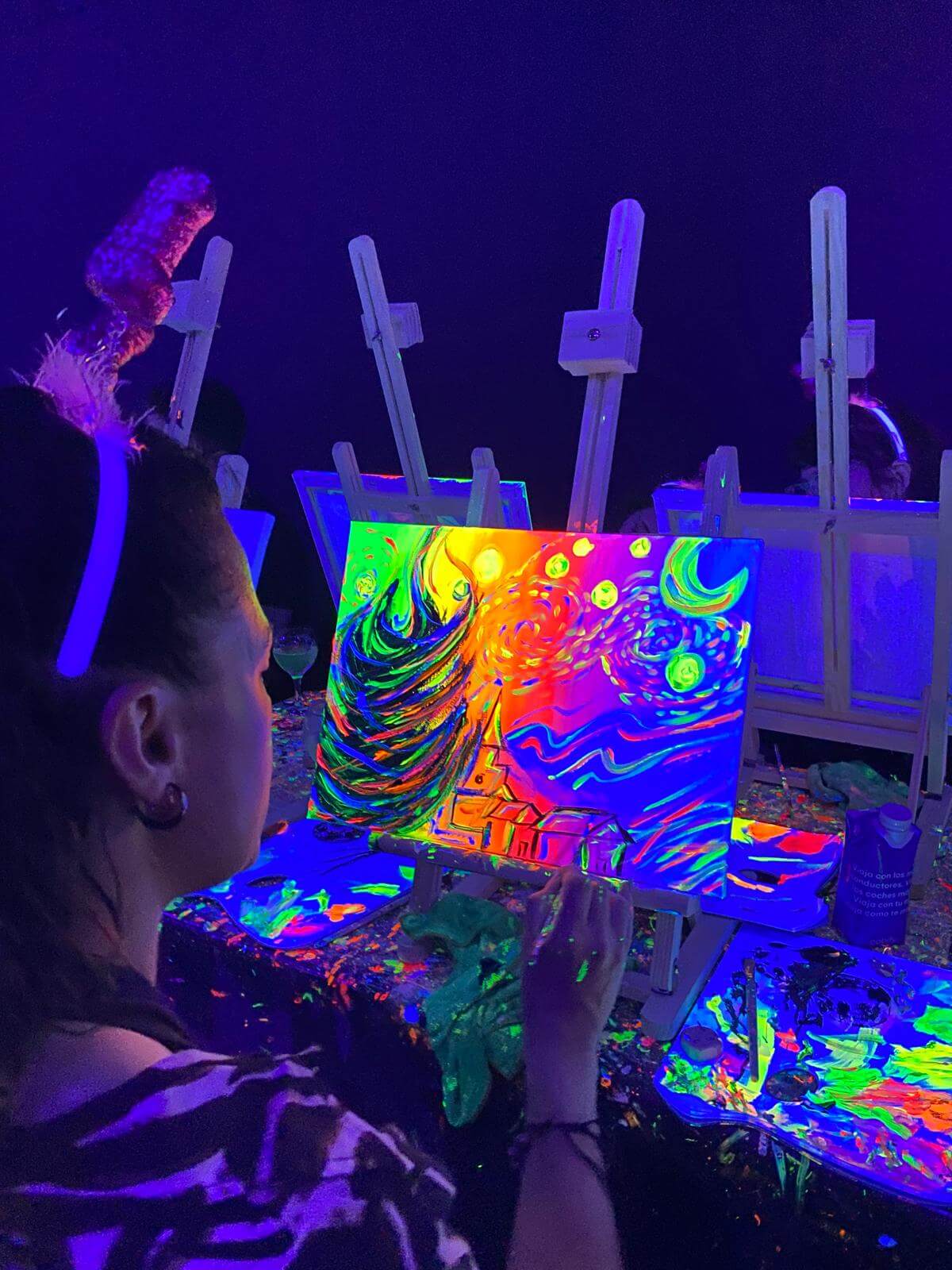 El punto de partida de esta aventura artística es una introducción a la obra maestra de Vincent Van Gogh, «La Noche Estrellada». Bajo la guía de nuestras artistas, cada participante se sumerge en el proceso de creación, explorando técnicas y dejando fluir su creatividad de forma única. La combinación de colores fluorescentes y la obra de Van Gogh cobra vida de manera sorprendente bajo la luz ultravioleta, creando una experiencia visualmente impactante.