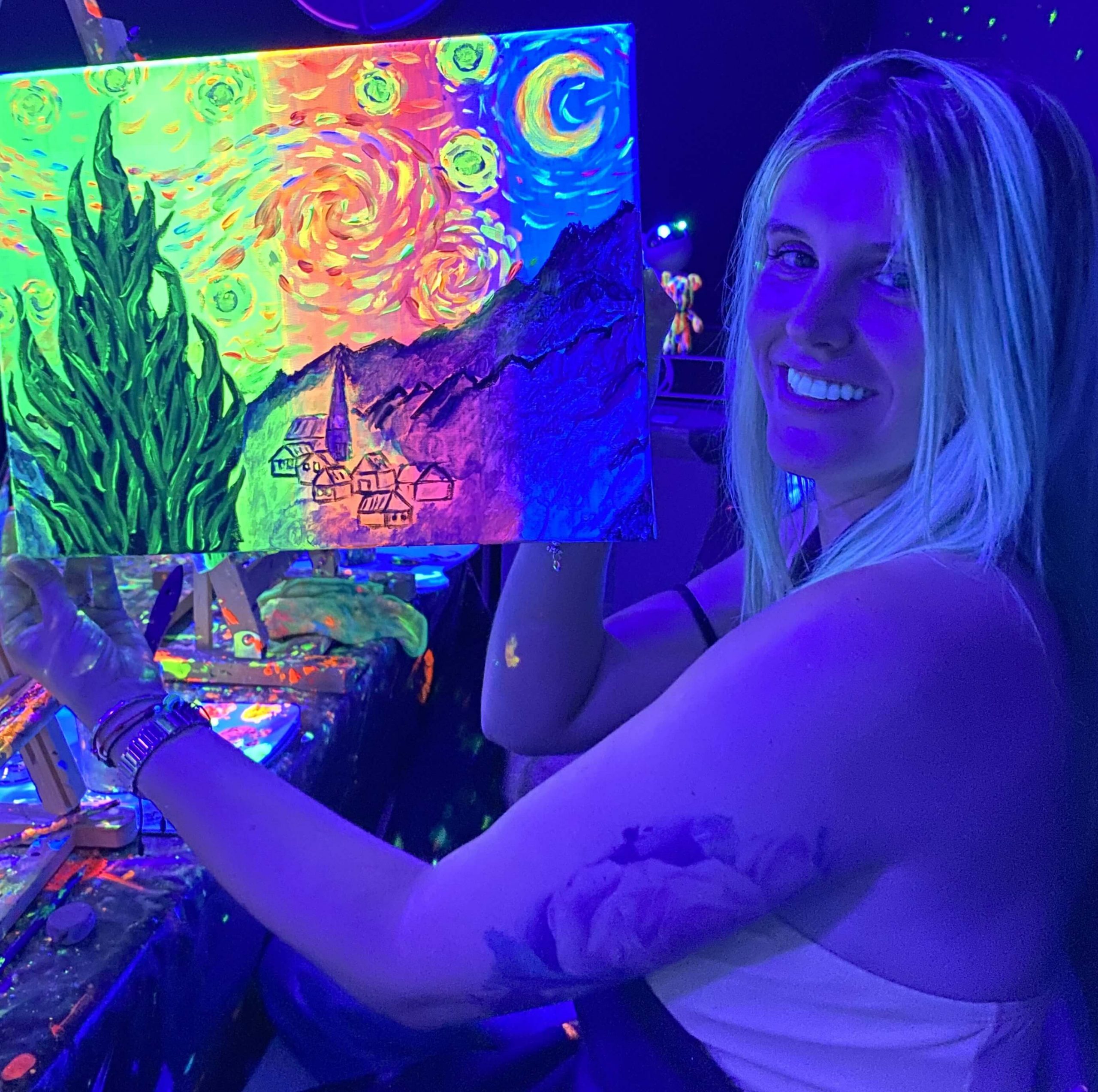 En esta modalidad, nuestros artistas te guiarán paso a paso para recrear la obra más icónica de Van Gogh: La Noche Estrellada. Aprenderás a trazar los remolinos del cielo nocturno y a jugar con la intensidad de los tonos neón que brillan bajo la luz negra. Esta experiencia es perfecta tanto si nunca has pintado antes como si ya tienes experiencia artística.