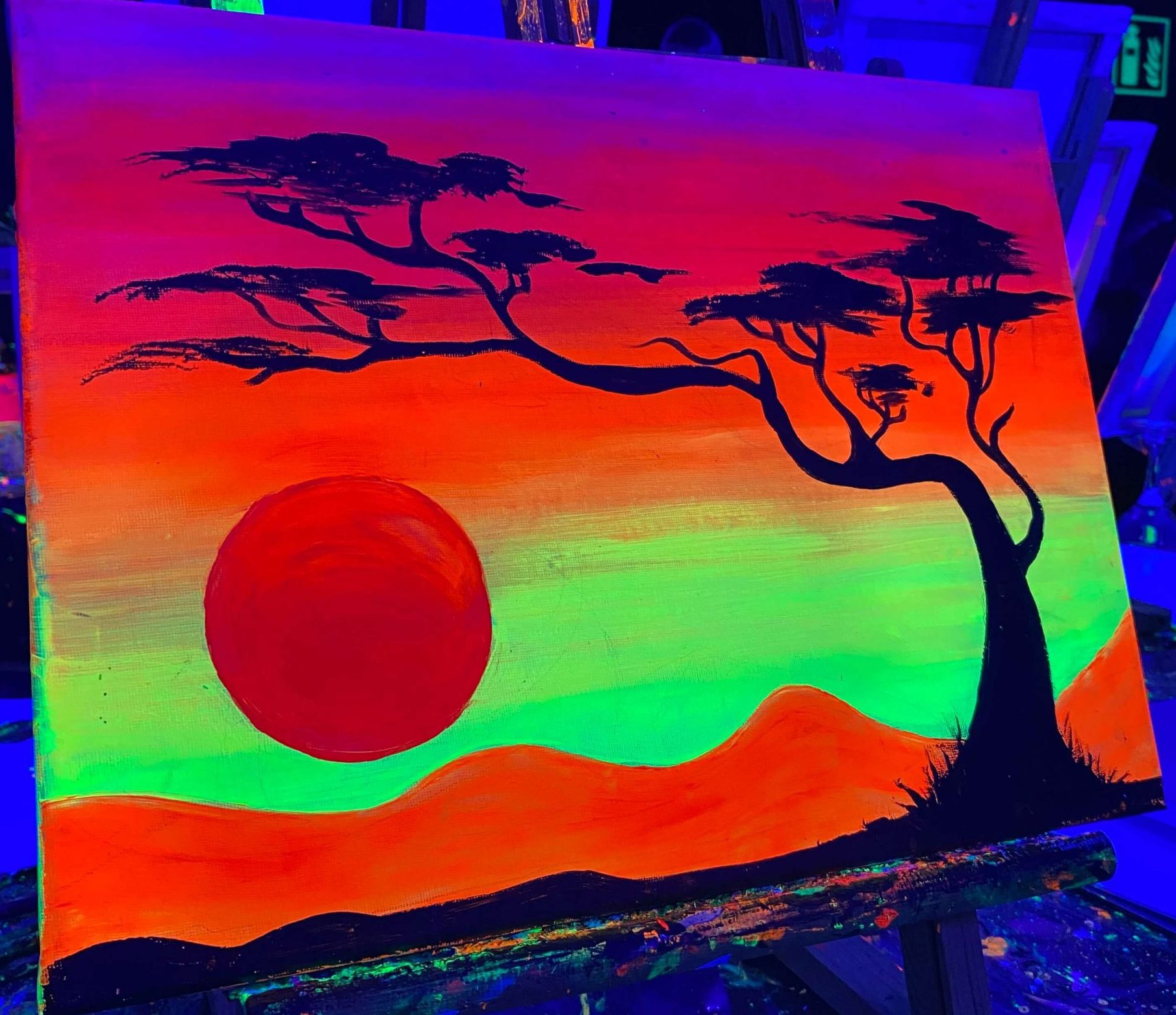 Cuadro fluorescente en Art Expereince de un sunset africano en Gracia.